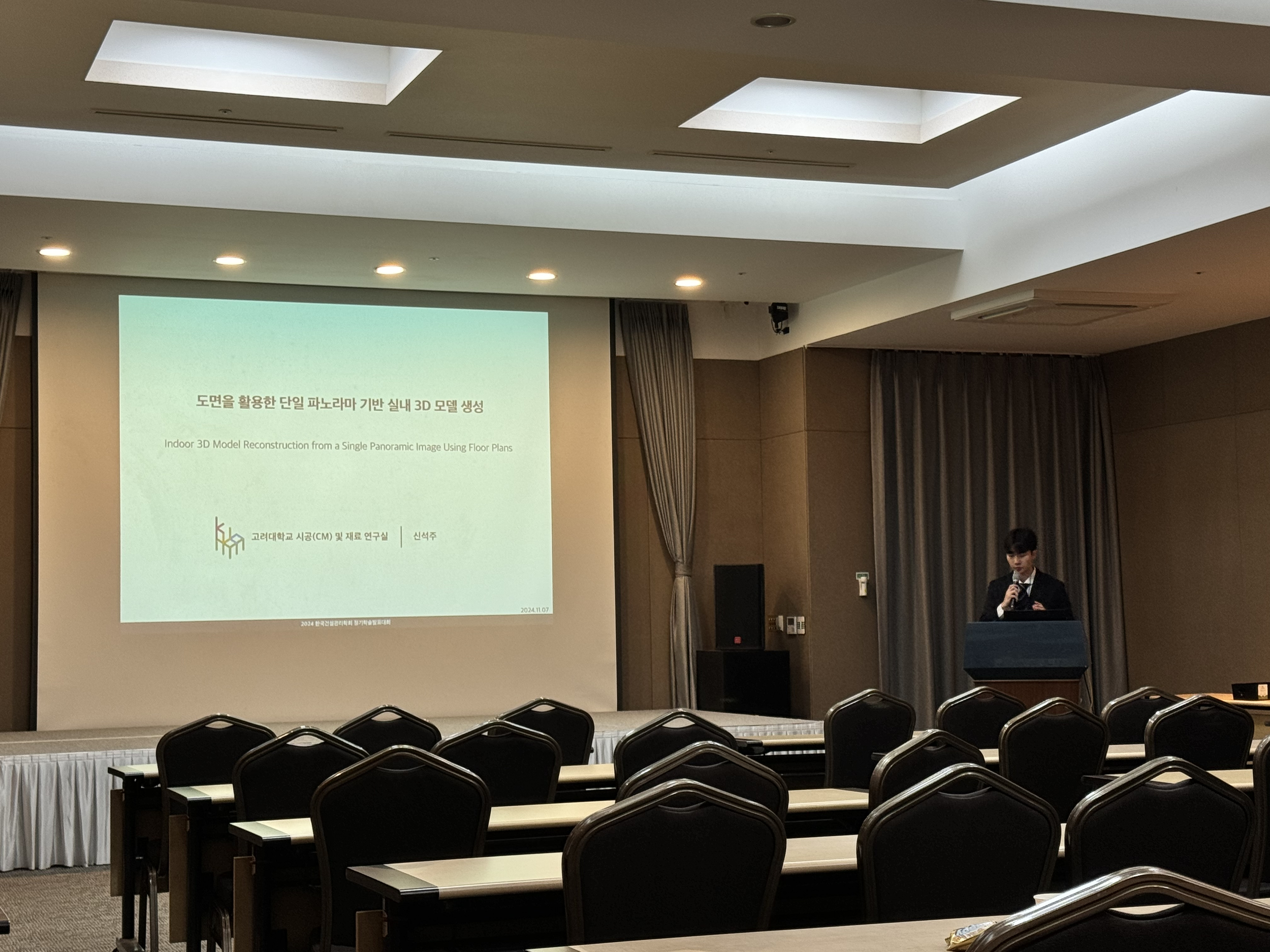 제주 소노캄에서 개최된 한국건축관리학회 추계학술발표대회에서 김형준 석사과정, 신석주 석사과정이 각각 ‘표준품셈 기반 도로공사 토공사 공종별 최적 건설장비 조합 선정 모델 개발’, ‘도면을 활용한 단일 파노라마 기반 실내 3D 모델 생성’에 관환 연구를 발표했습니다.
