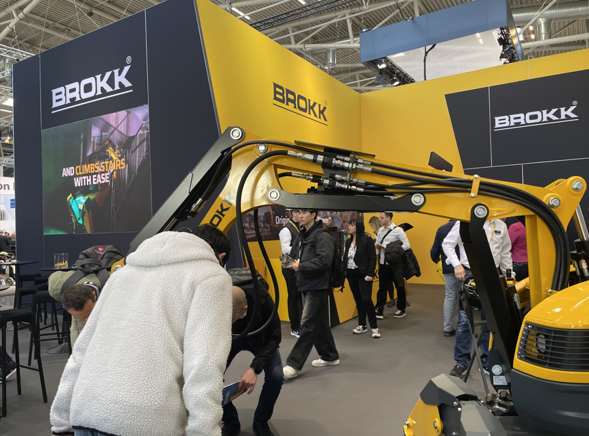 박람회에 참관한 연구원들이 최신 건설 기계와 디지털 기술에 대한 설명을 듣고, 전시된 장비를 직접 살펴보는 모습